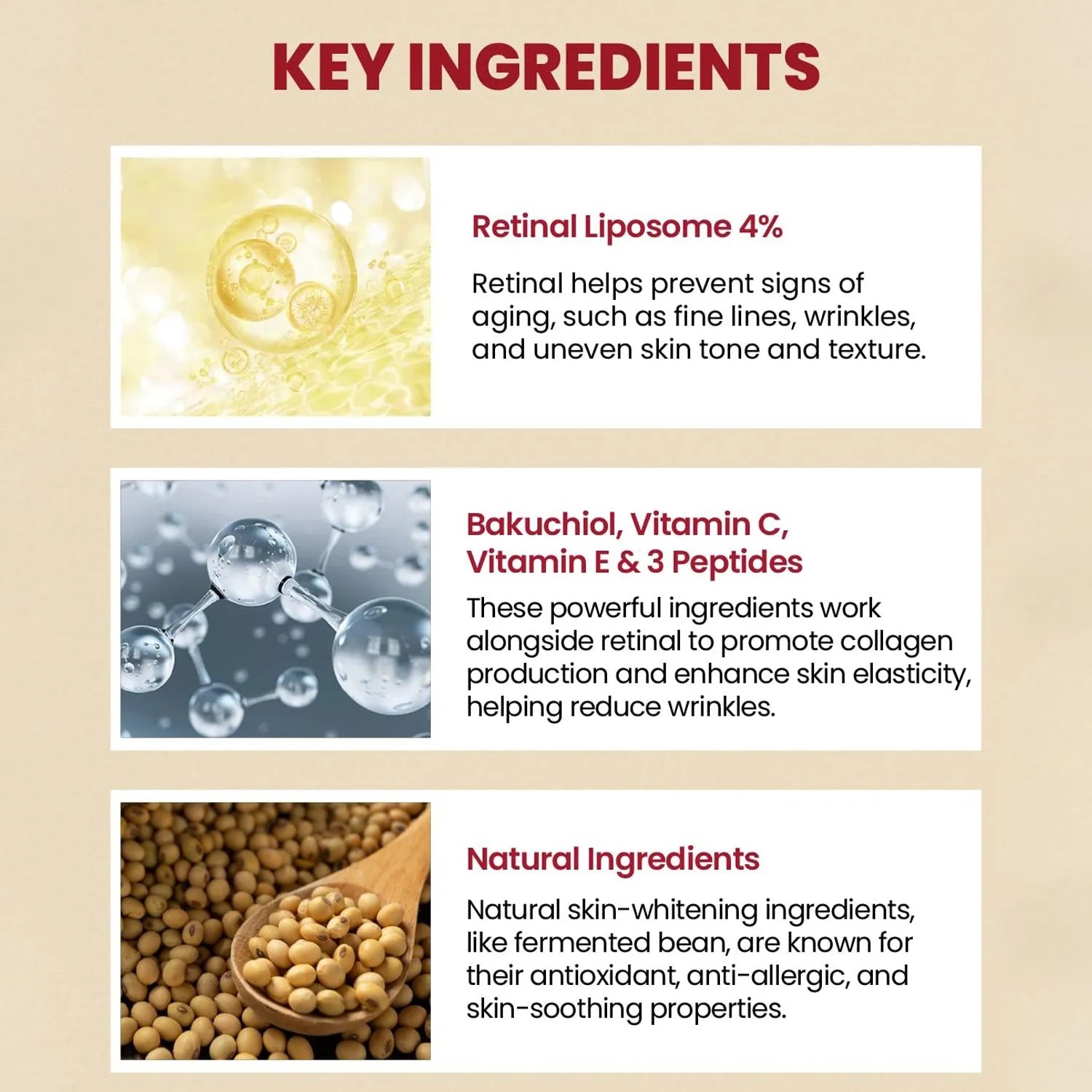 Bakuchiol + Peptides + Vitamin C & E – Enhance collagen, improve elasticity, and firm the skin